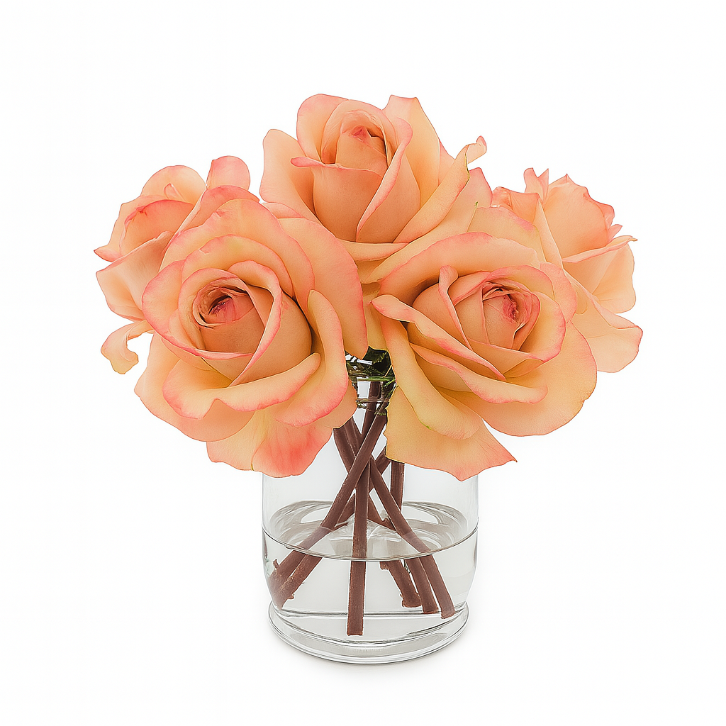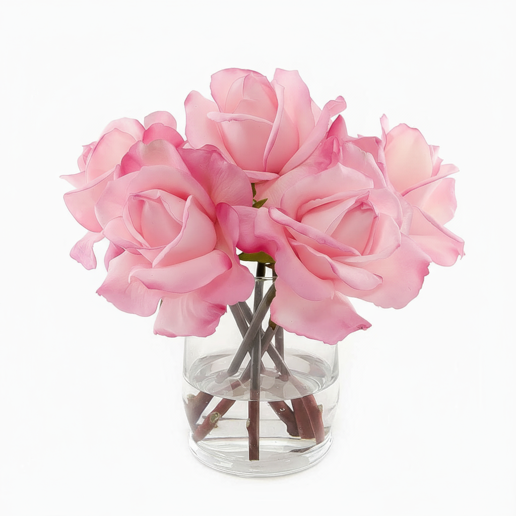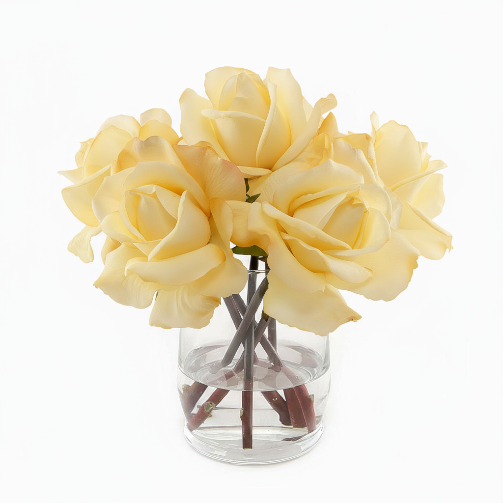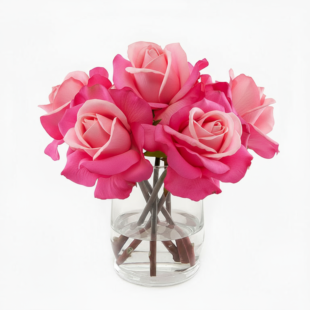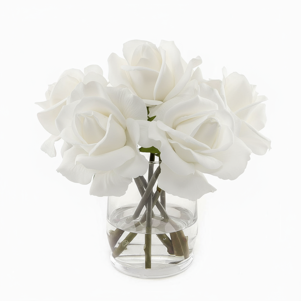 This real touch arrangement has a mix of open artificial roses and buds. Some acrylic water is also added to ensure realism. It's a simple but contemporary floral design for your home.